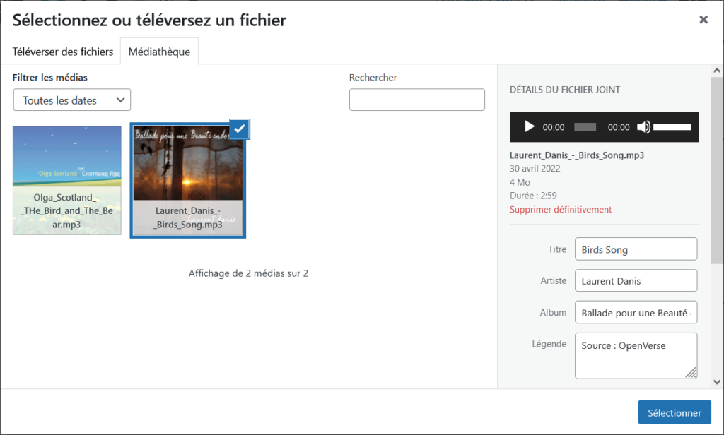 Lorsque vous utilisez un fichier provenant de la médiathèque, vous pouvez renseigner ses métadonnées avant de cliquer sur Sélectionner : en saisissant des valeurs dans les champs Titre, Artiste, Album, Légende et Description. Si vous utilisez l’option Téléverser ou Insérer à partir d’une URL, il vous faudra vous rendre ultérieurement dans la Médiathèque pour saisir ces métadonnées.