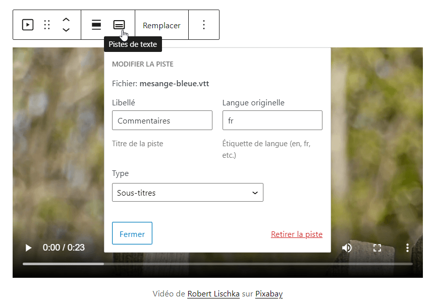 Si vous souhaitez supprimer l’association entre la vidéo et le fichier de piste de texte, il suffit de cliquer sur le lien Retirer la piste.